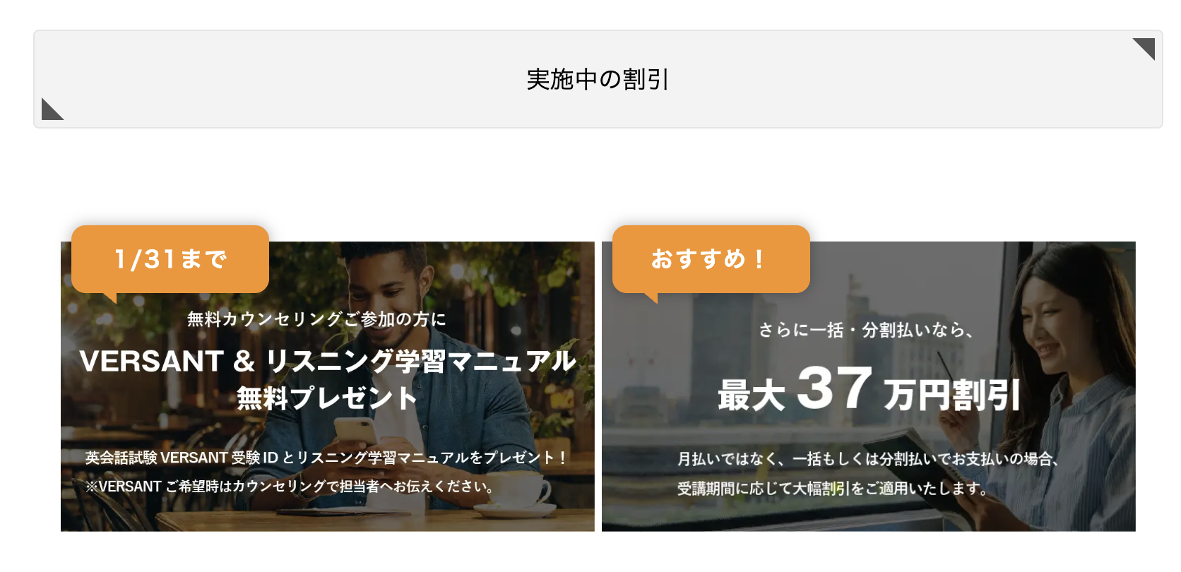 | ①無料カウンセリング特典 | VERSANT受験ID(6,600円相当)+リスニング学習マニュアル | 無料カウンセリング参加者 | 〜2026年1月31日 |